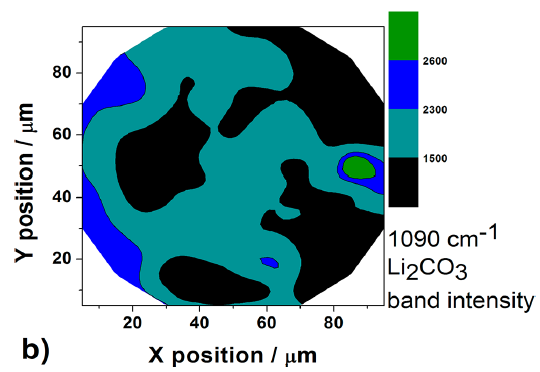 右圖:Raman mpping,LiNi0.5Mn0.5O2在放電至2V後,Li2CO3在1090cm-1的峰的強度