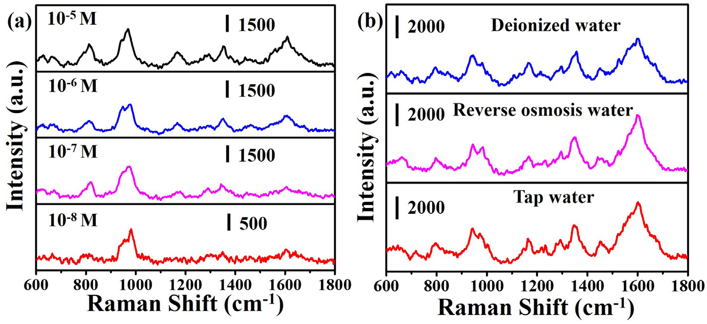 圖(a) 以不同濃度的R6G測試SERS chip之性能。