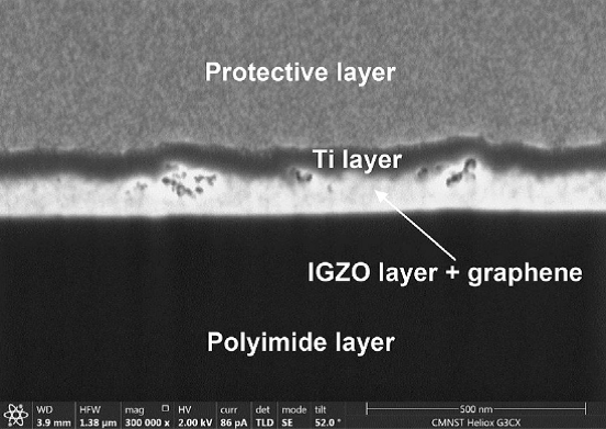 石墨烯經由CVD製程轉置於IGZO薄膜後附著於Polyimide材料,Ti薄膜與保護層.